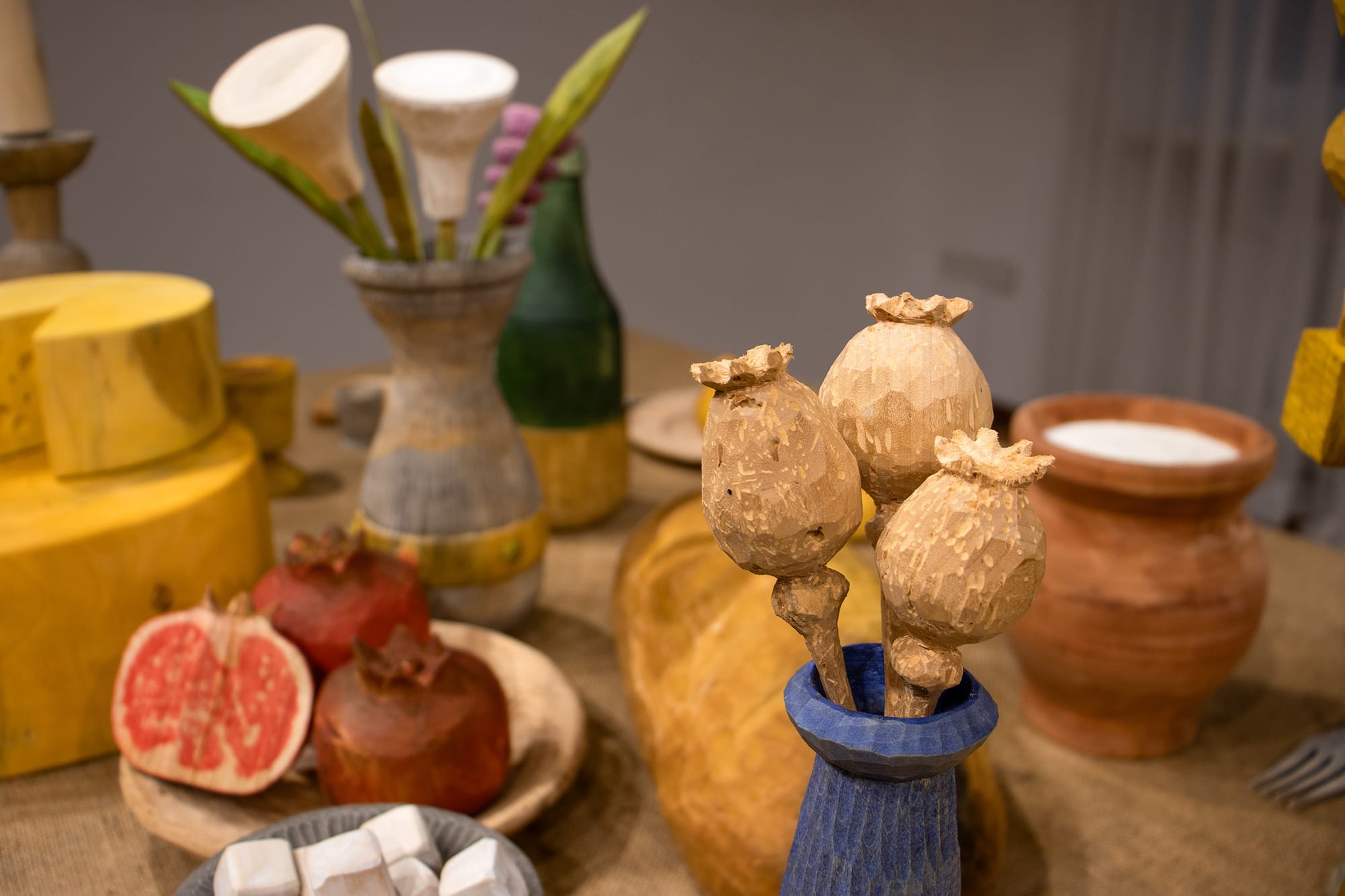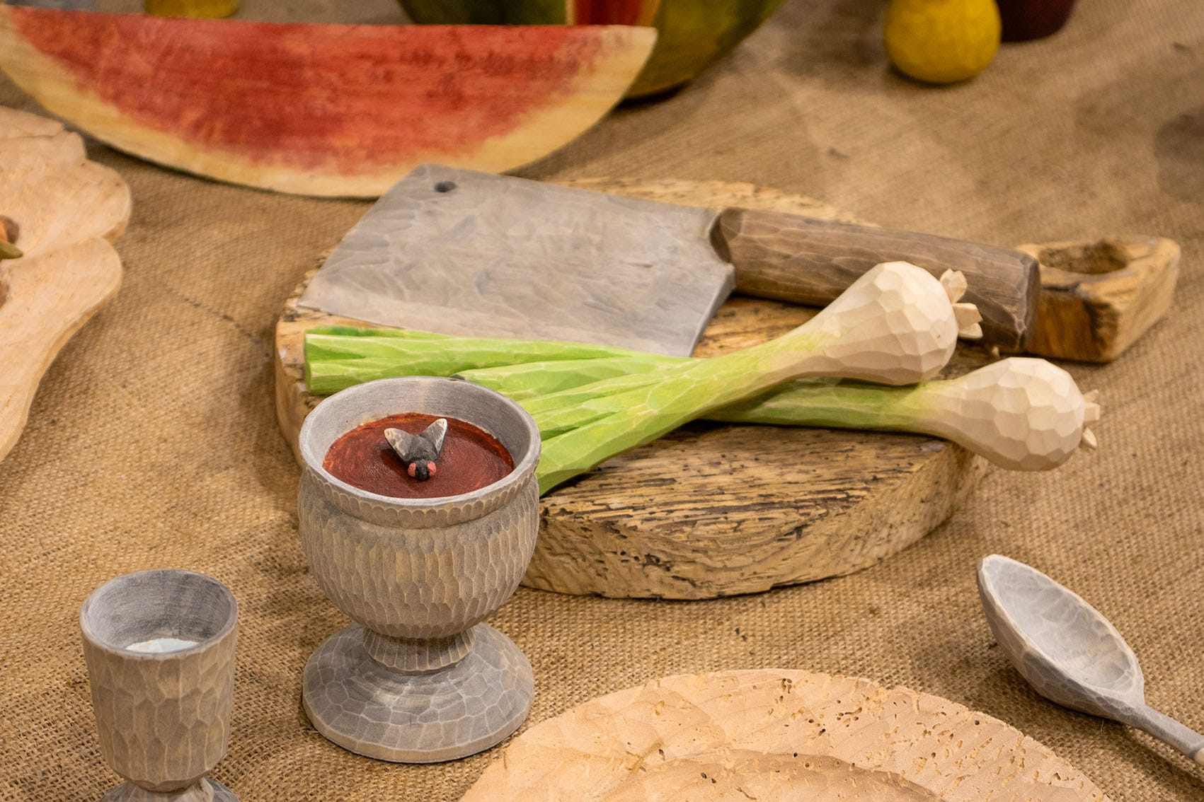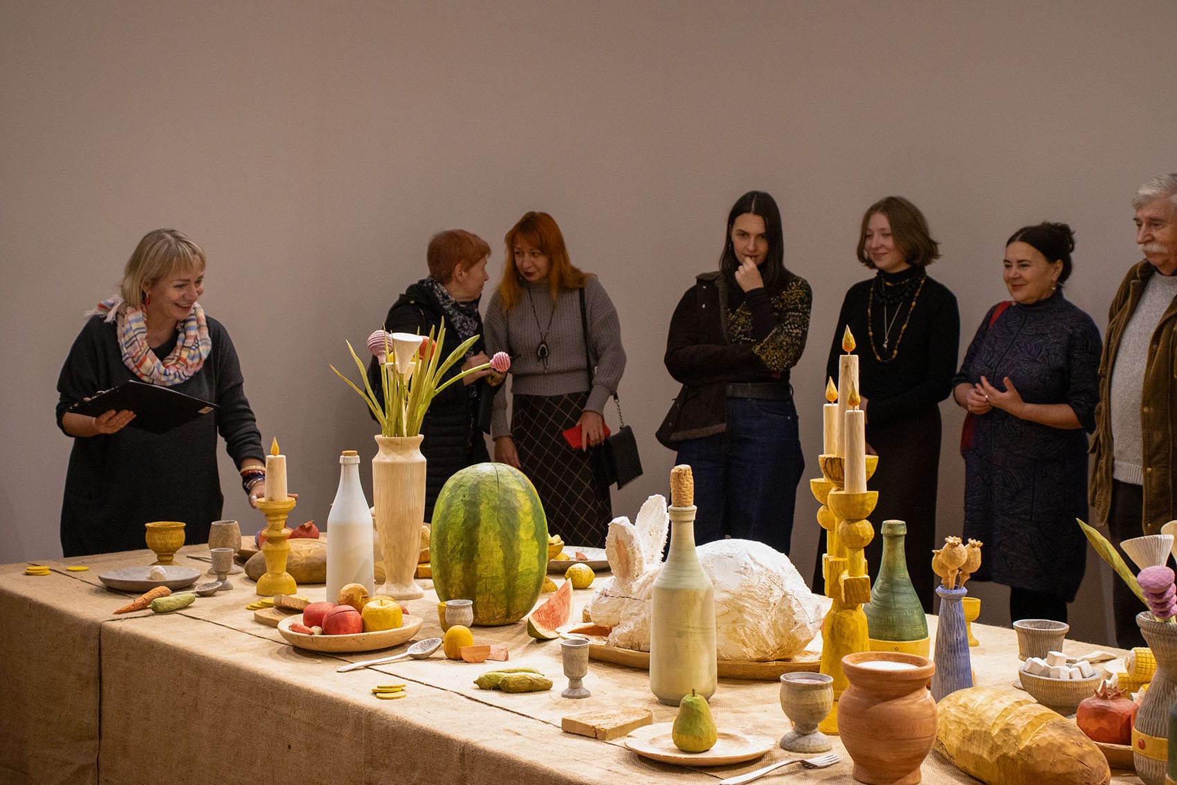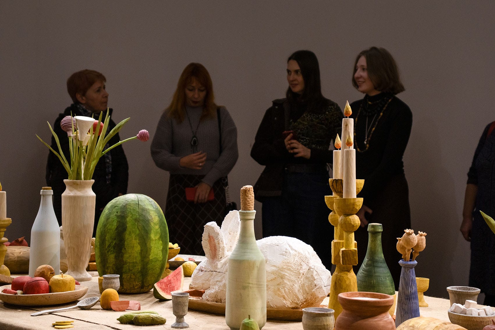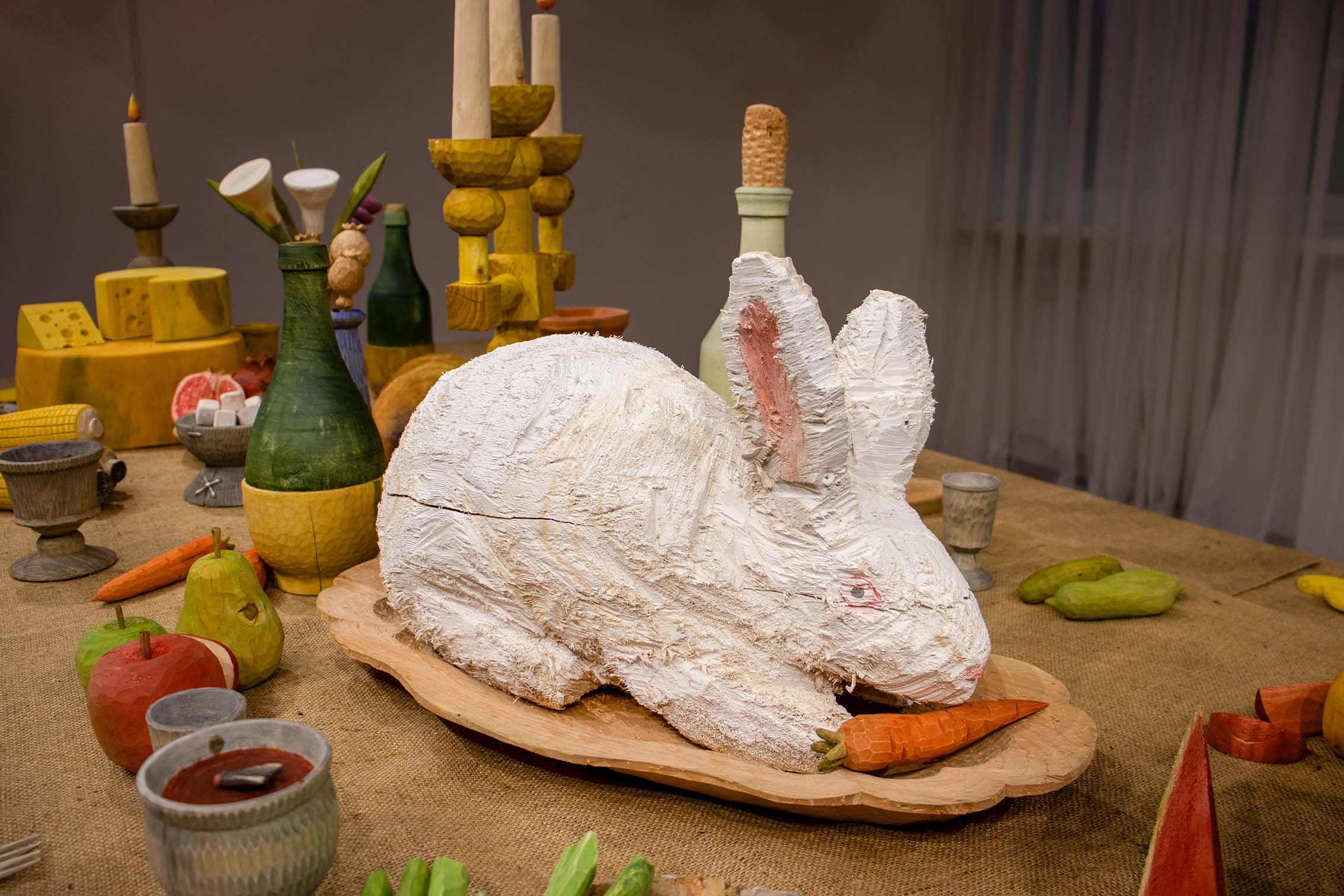 У центрі столу розміщена фігура кроля, який не є учасником бенкету. Він не став приготовленою їжею, проте не є вільним: присутній, яскравий, заспокоєний деревом, проте у самій формі закладений постійний страх. Поруч лежить тесак — звичайний інструмент, який у цій ситуації стає маркером загрози.