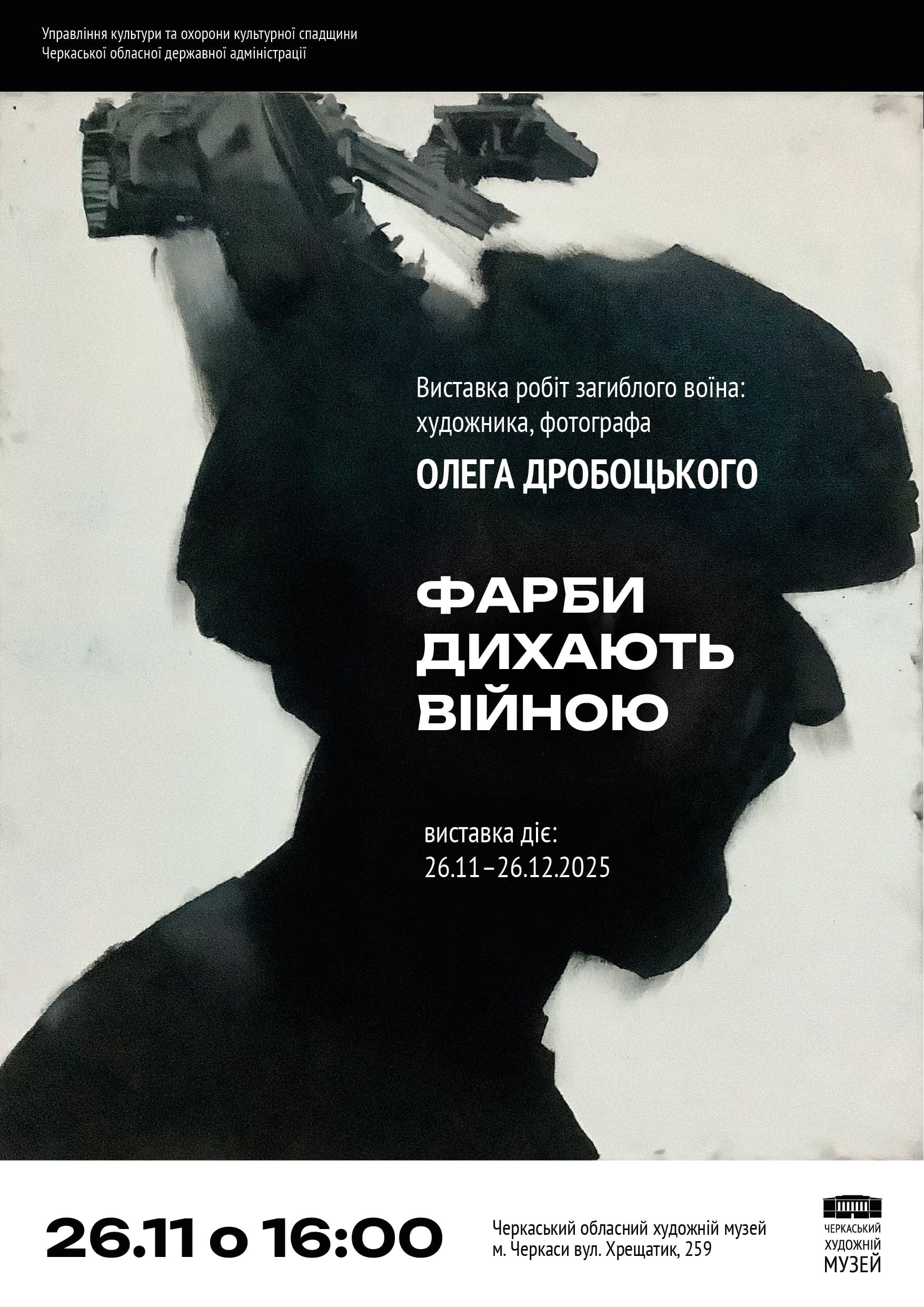 26 листопада о 16:00 —відкриття виставки загиблого воїна, художника, фотографа Олега Дробоцького «Фарби дихають війною»