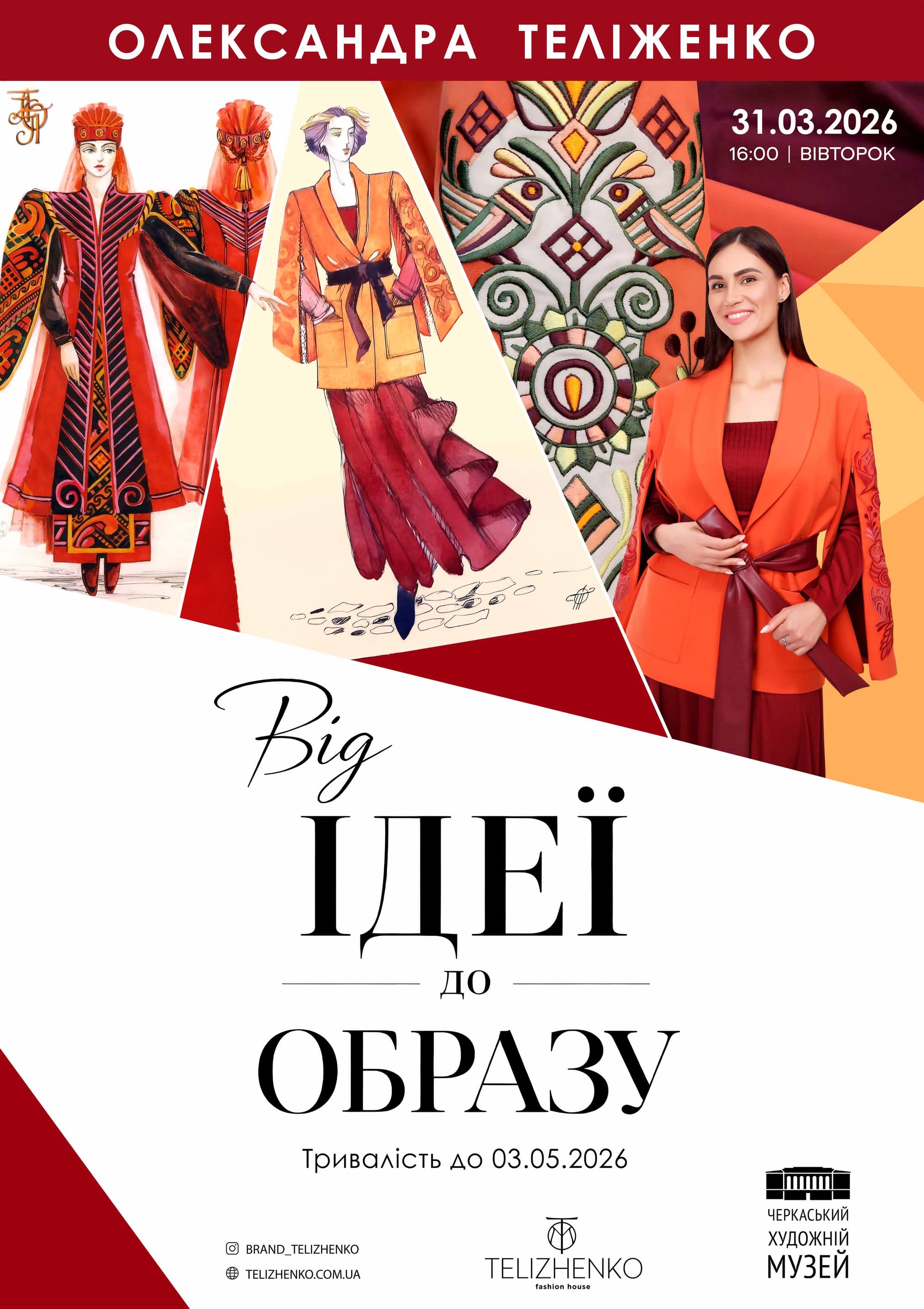 31 березня у Черкаському художньому музеї відбулось відкриття персональної виставки заслуженої художниці України Олександри Теліженко «Від ідеї до образу». Олександра Теліженко — одна з художниць сьогодення, яка творить не просто сценічний одяг, а справжнє мистецьке вбрання з яскраво вираженими рисами національної ідентичності. Найчастіше художниця декорує одяг вишивкою, орнамент якої притаманний Черкащині,
